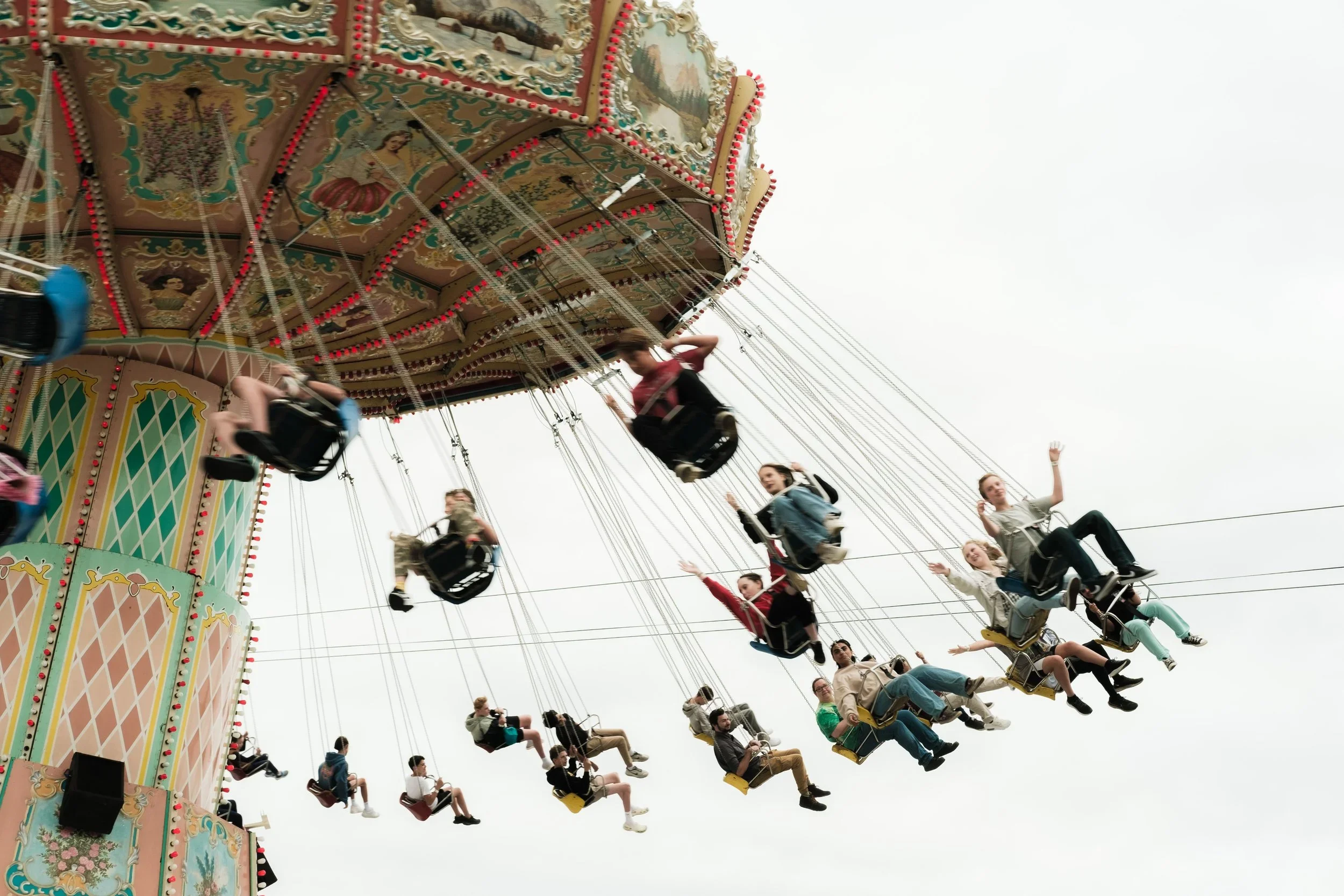 People riding a colorful vintage-style swing ride at an amusement park against a cloudy sky.