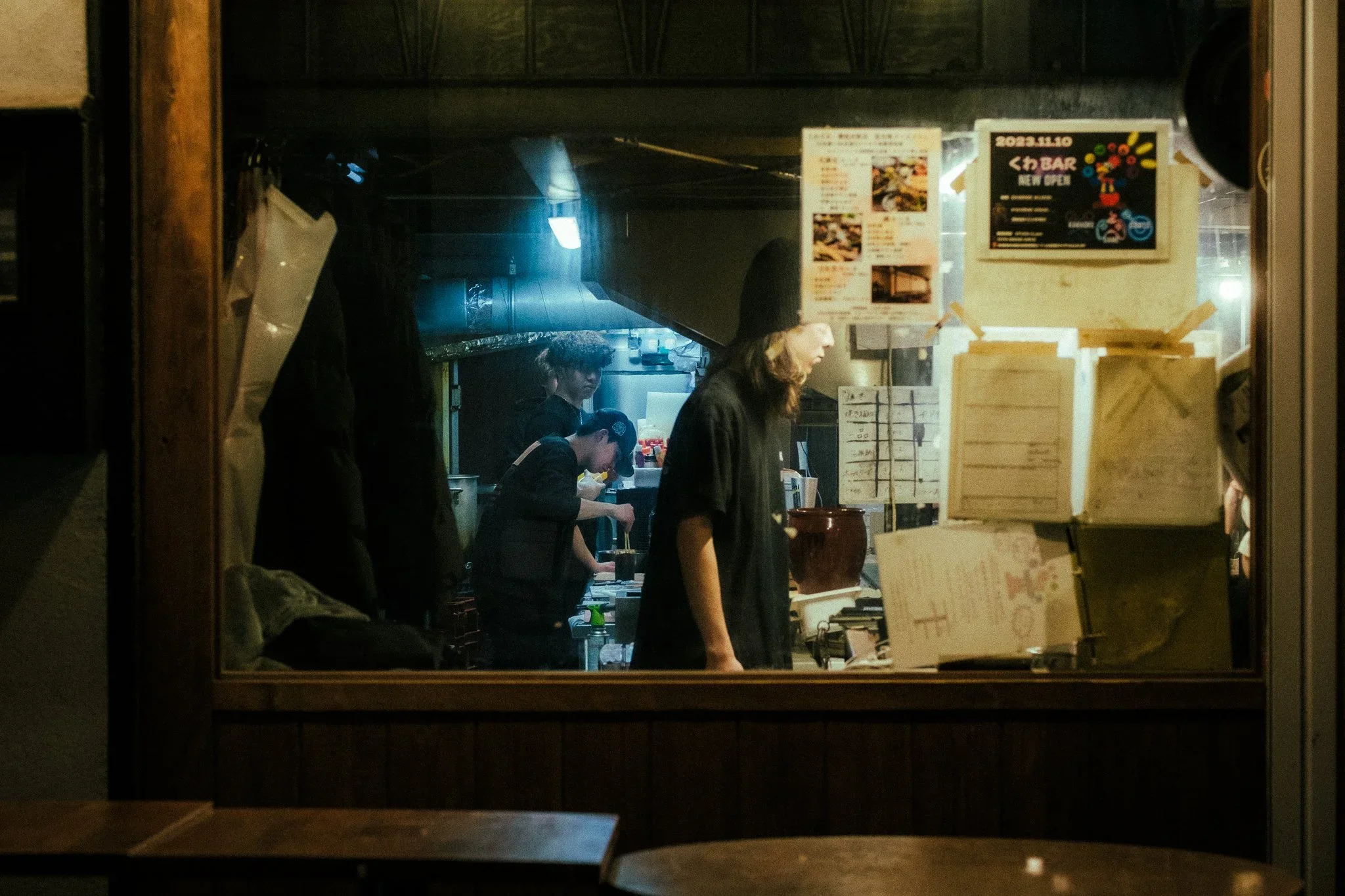 View of a small Japanese restaurant kitchen seen through a window, with chefs preparing food in the background and various signage posted on the wall.
