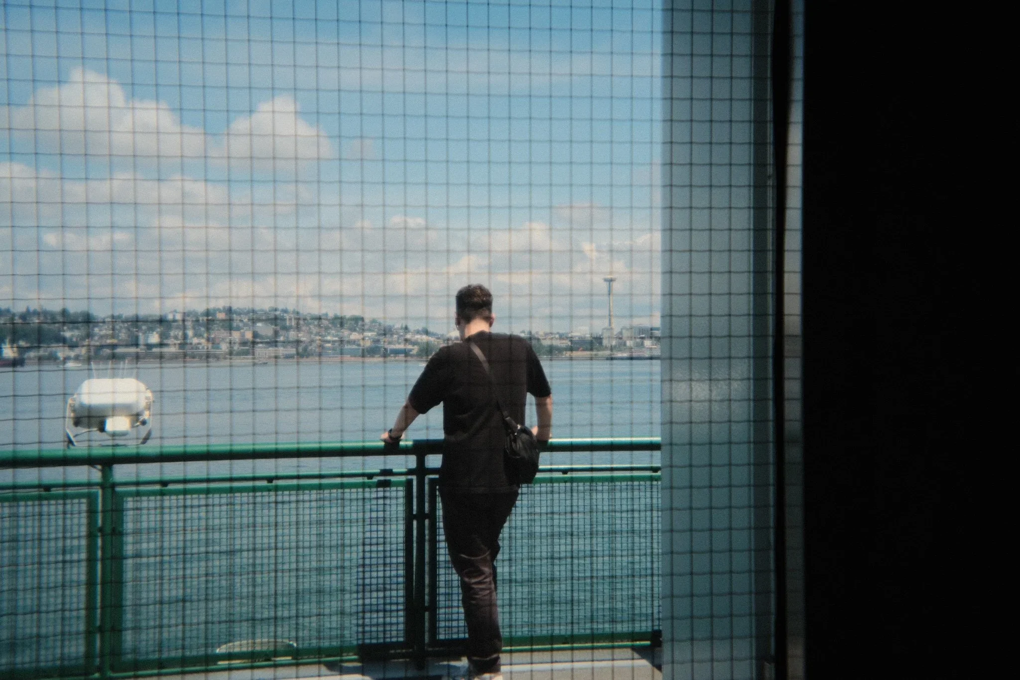 Person in black shirt leaning on a railing, looking out at a water body and a distant city skyline through a window with grid pattern. View fullsize