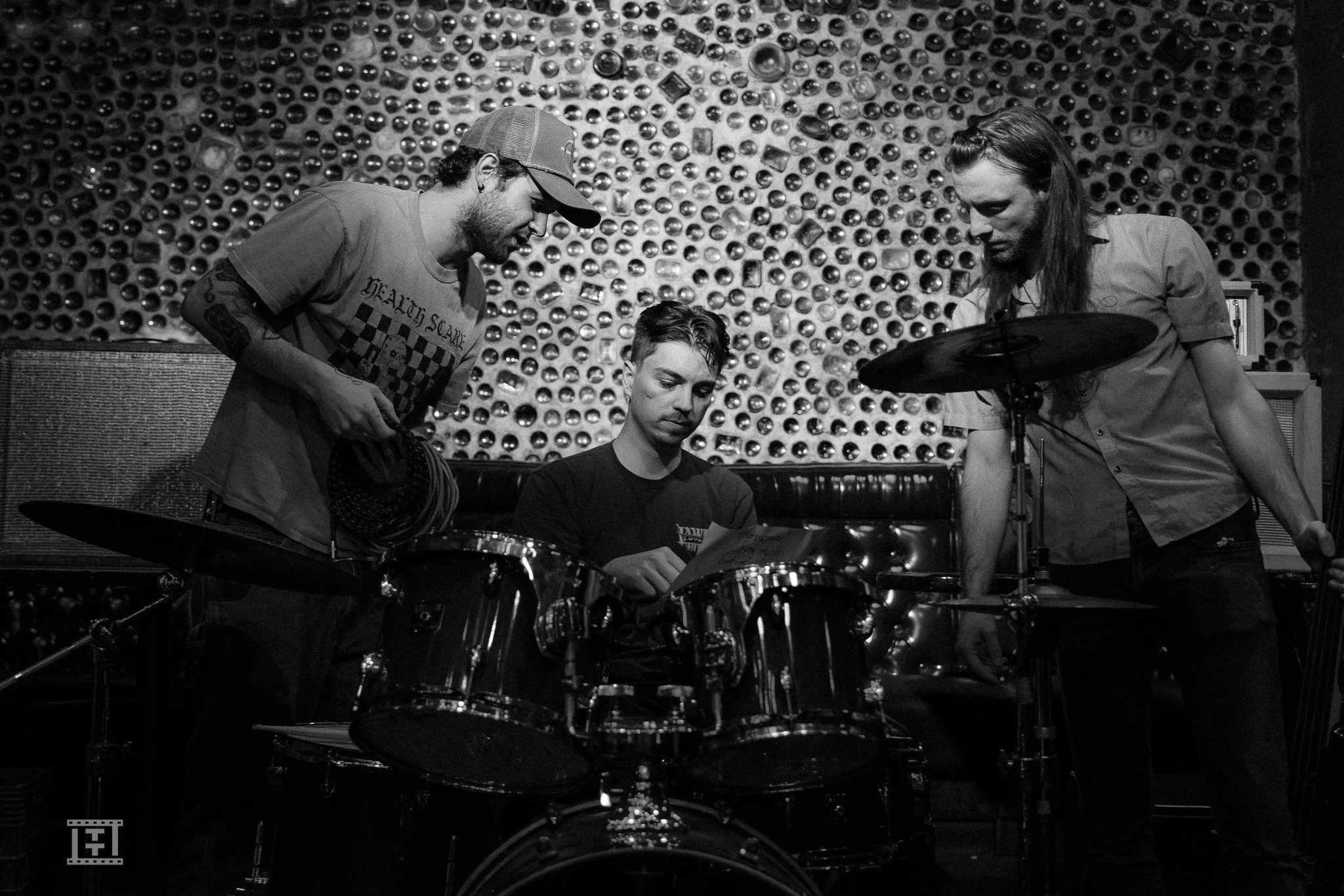 Three musicians in a dimly lit room, two standing on either side of a seated drummer reviewing sheet music, with a wall decorated with bottles in the background. View fullsize
