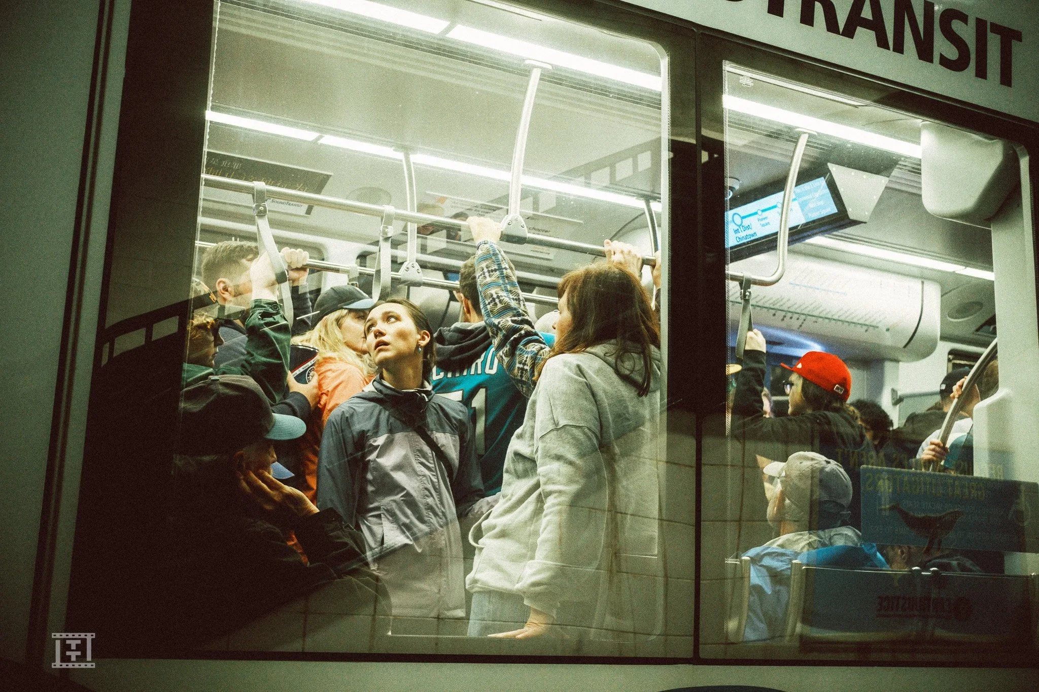 People standing and sitting inside a crowded subway train, some holding onto handrails, with a view through the window showing reflections and the transit sign outside. View fullsize