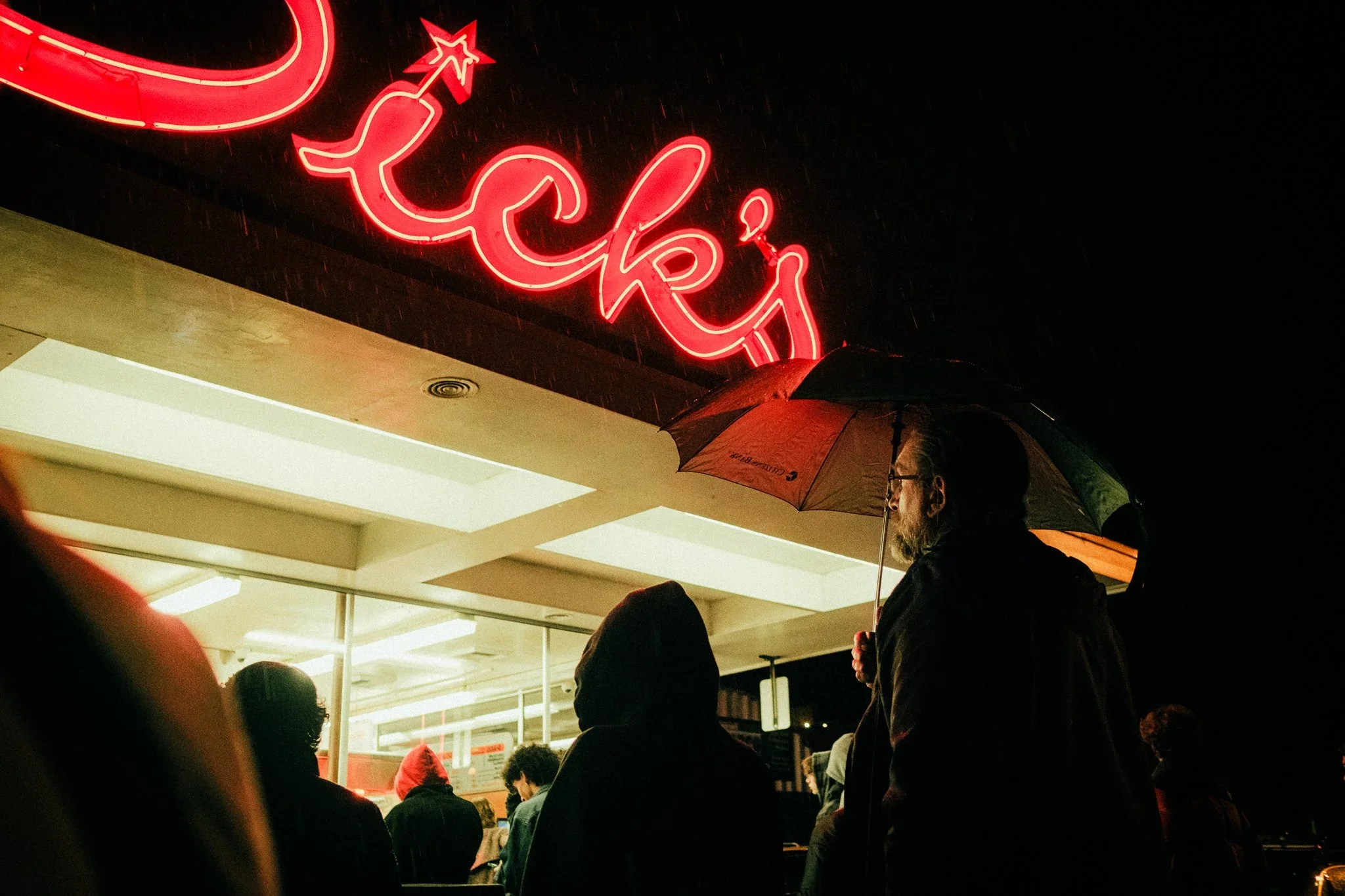 A person holding an umbrella stands outside a Billie’s restaurant at night, with a neon fish sign glowing above. View fullsize