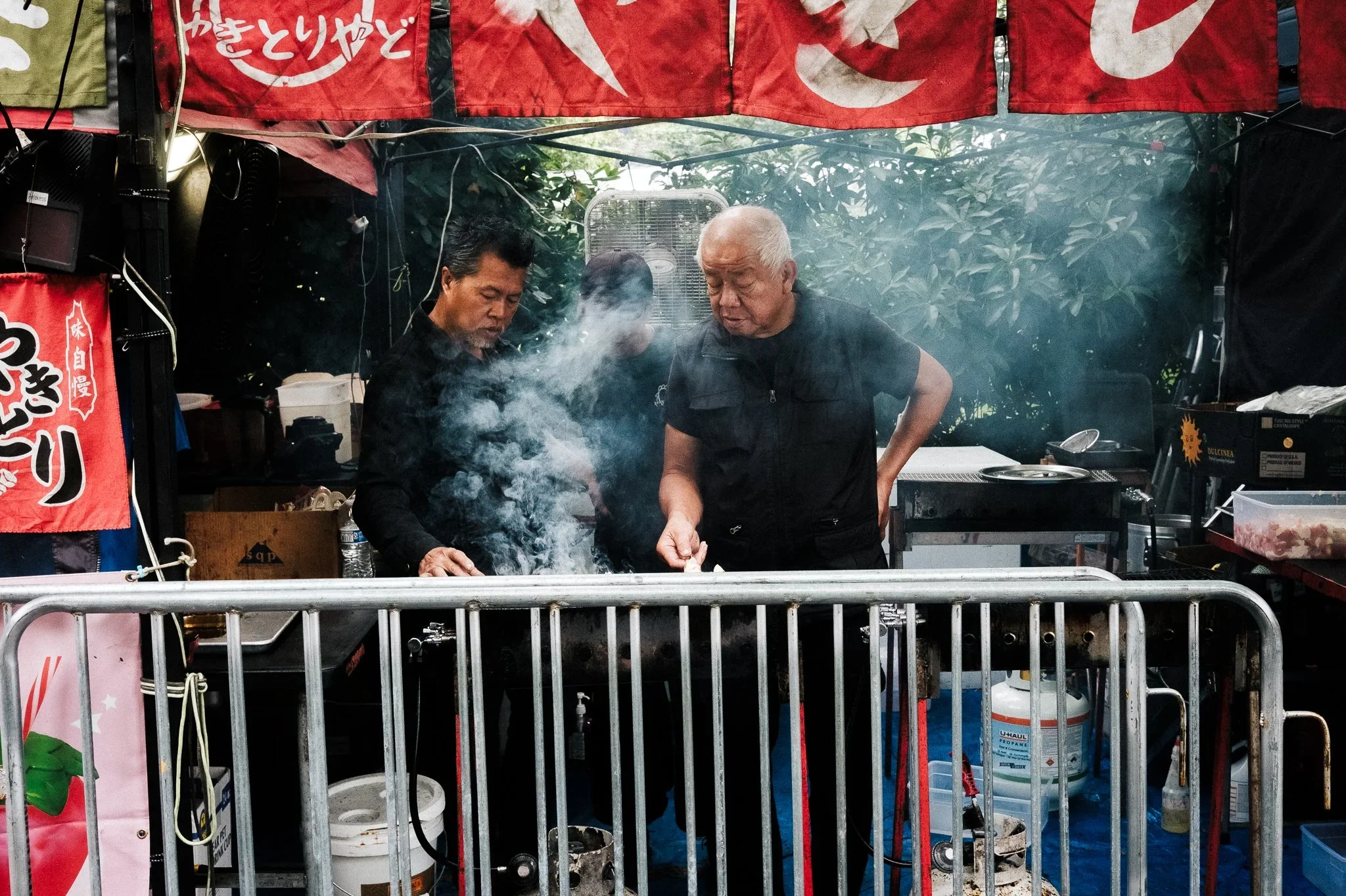 Two men cook on a barbecue grill at an outdoor food stall, with smoke rising from the grill and red banners with Japanese characters hanging above. View fullsize
