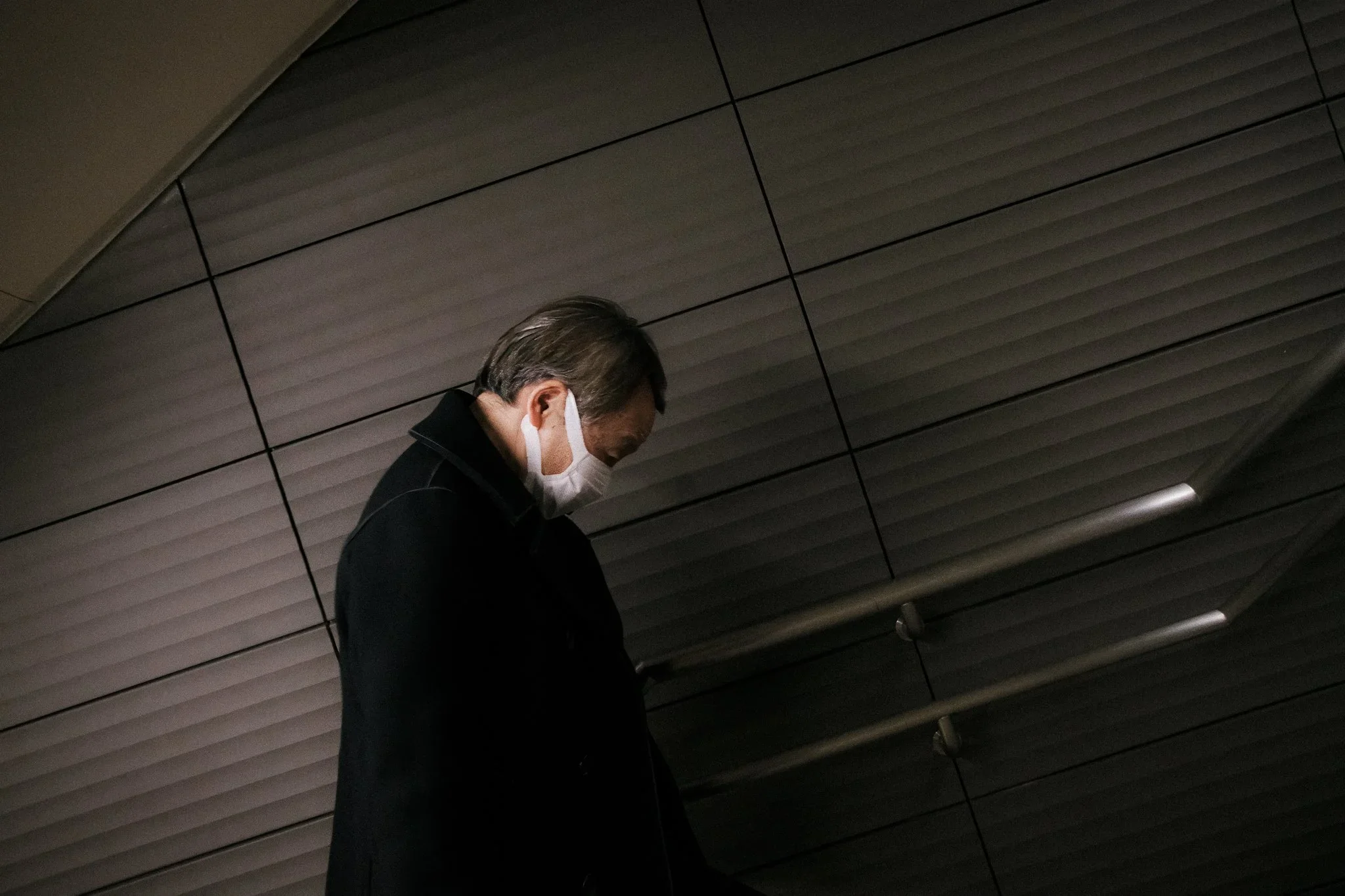 A person wearing a face mask looking downward in a dimly lit setting with a wooden ceiling.