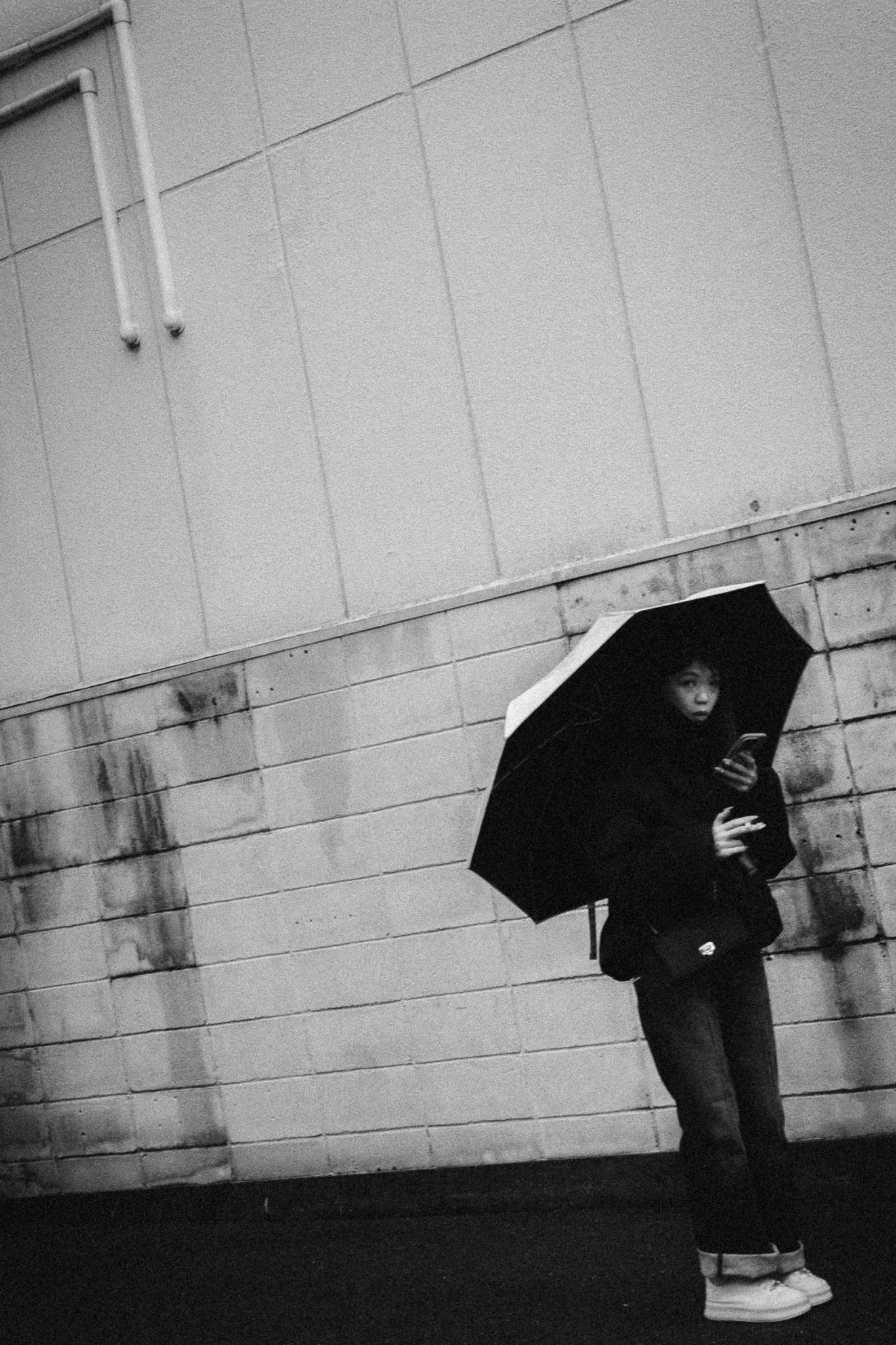 A young woman stands against a wall holding an umbrella and looking at her phone, in black and white, urban setting. View fullsize