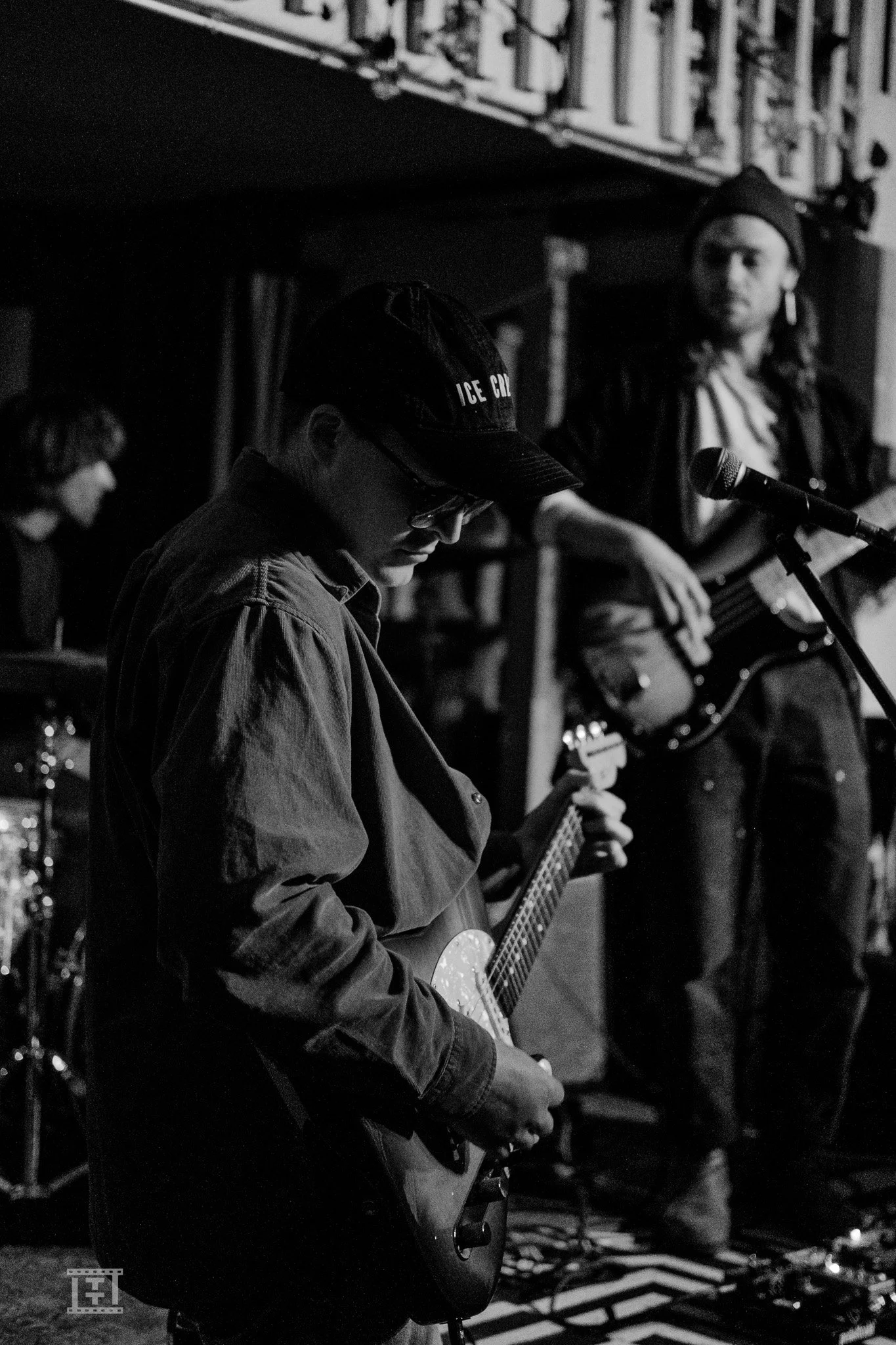 A band performing on stage, with a young man in the foreground playing an electric guitar, wearing glasses and a cap that reads 'ICE CITA.' Two other musicians are visible in the background, one playing drums and the other playing bass guitar.