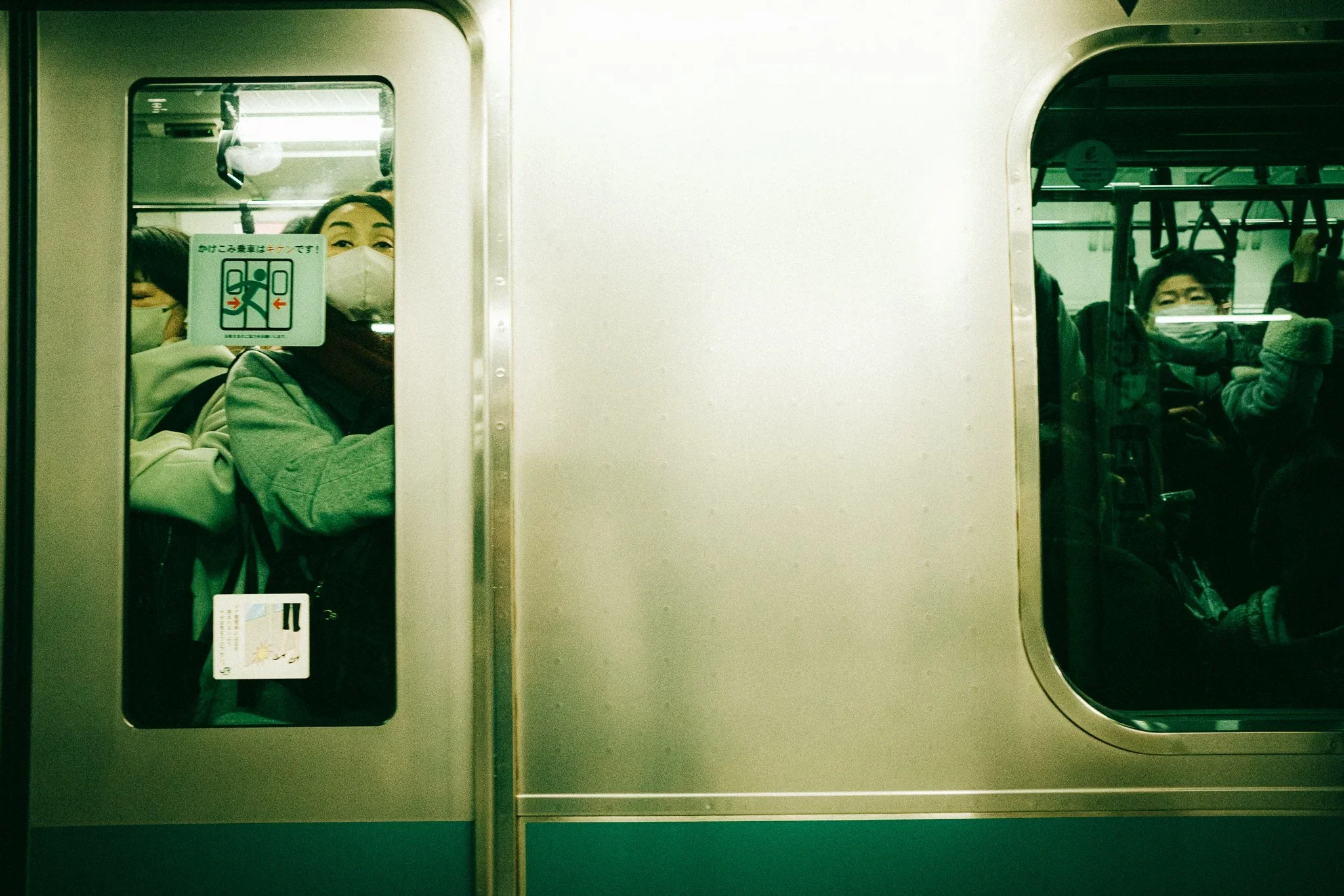 Passengers wearing masks inside a train, visible through its windows in Tokyo.