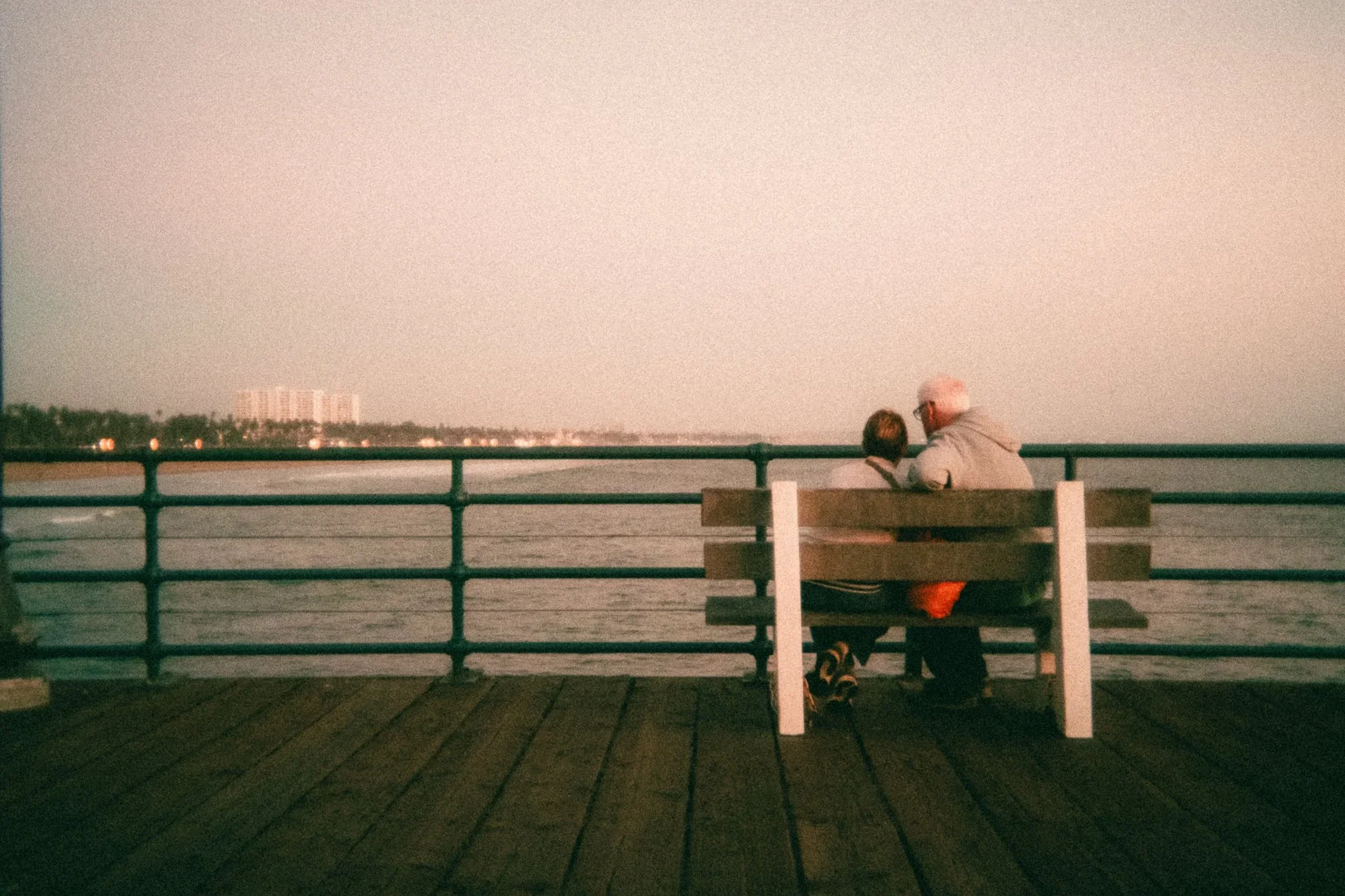 Two people sitting on a wooden bench on a pier, looking out over the water during sunset or dusk.
