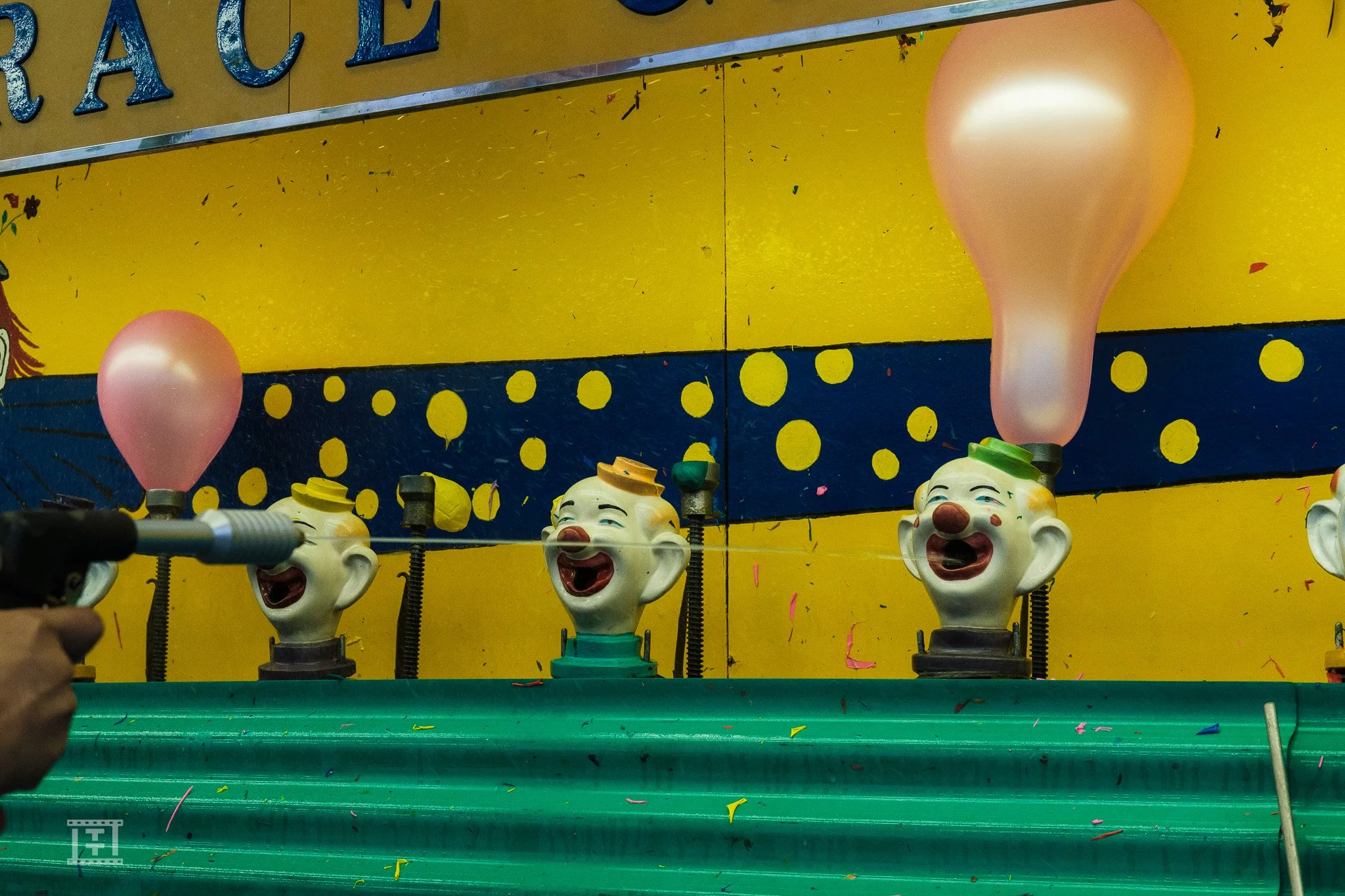 Clown head carnival game with balloon explosions, set against a bright yellow background with blue and yellow dots.