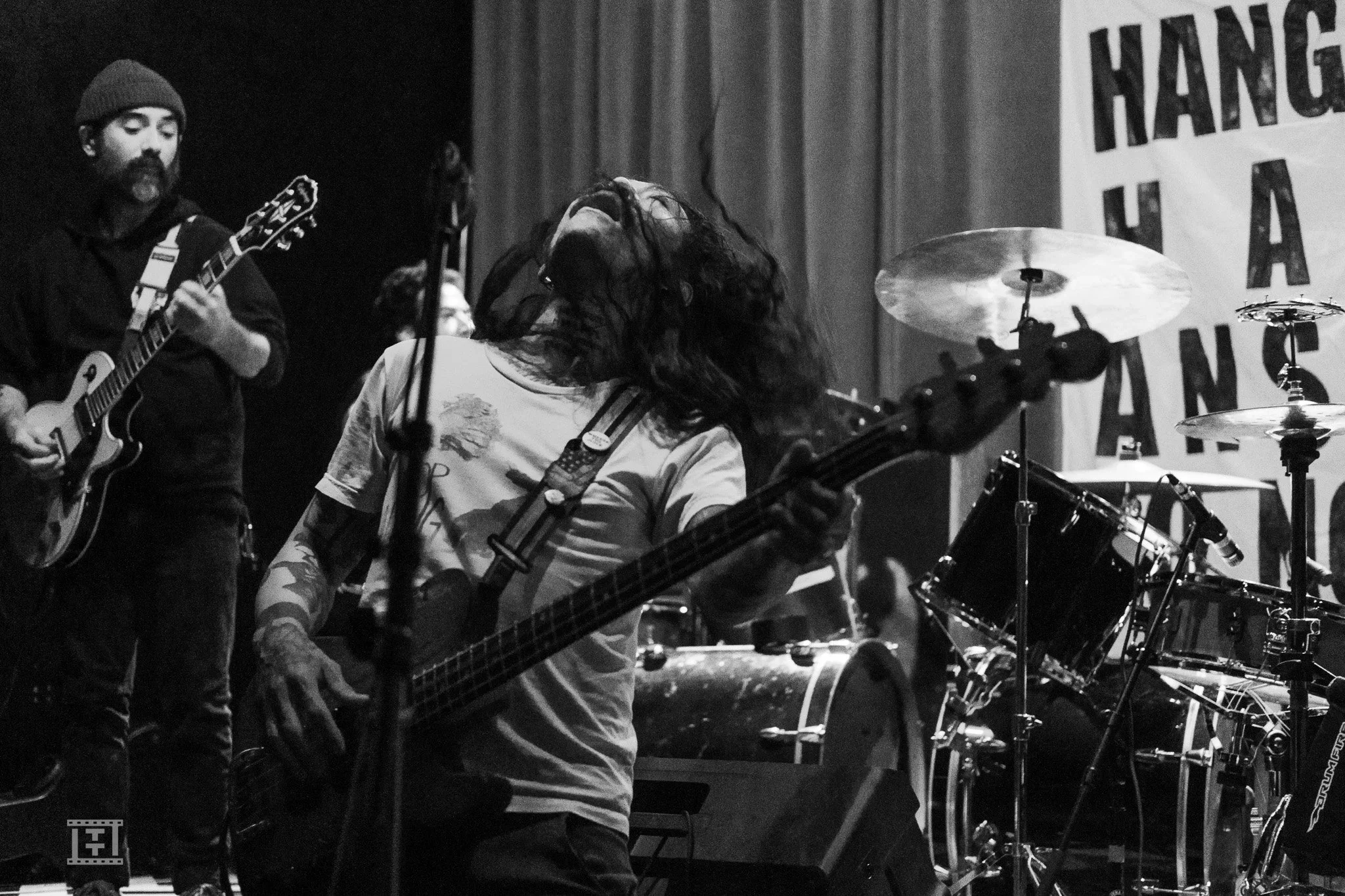 Black and white photo of a band performing on stage, with a guitarist and a bassist with long hair, drums, and a partially visible poster in the background.