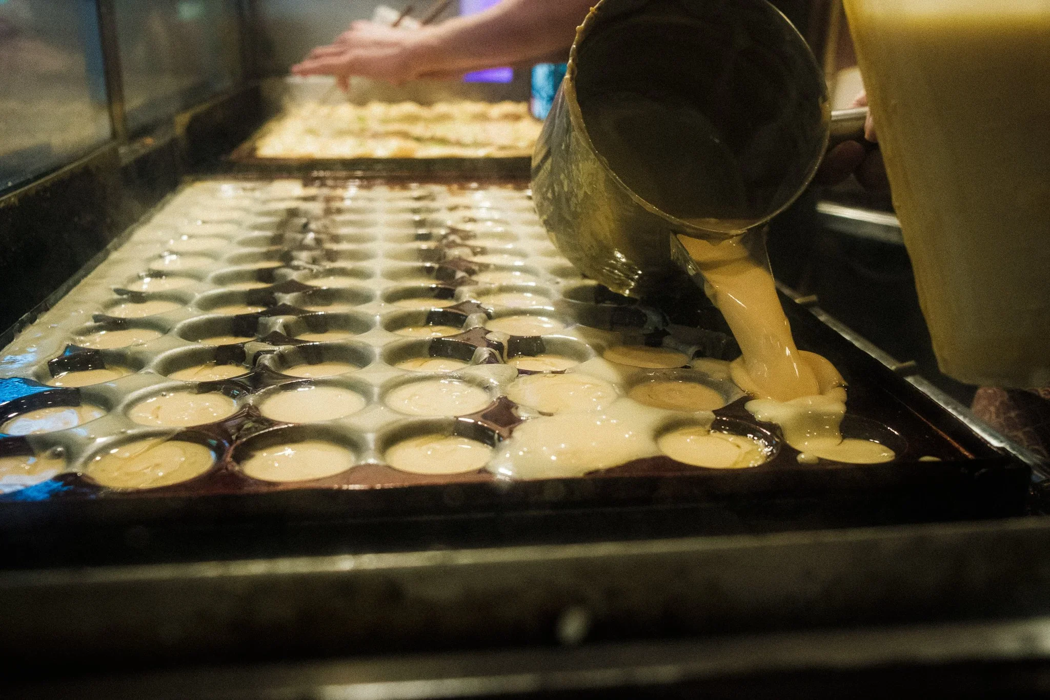 Pouring batter into a takoyaki pan for cooking. View fullsize