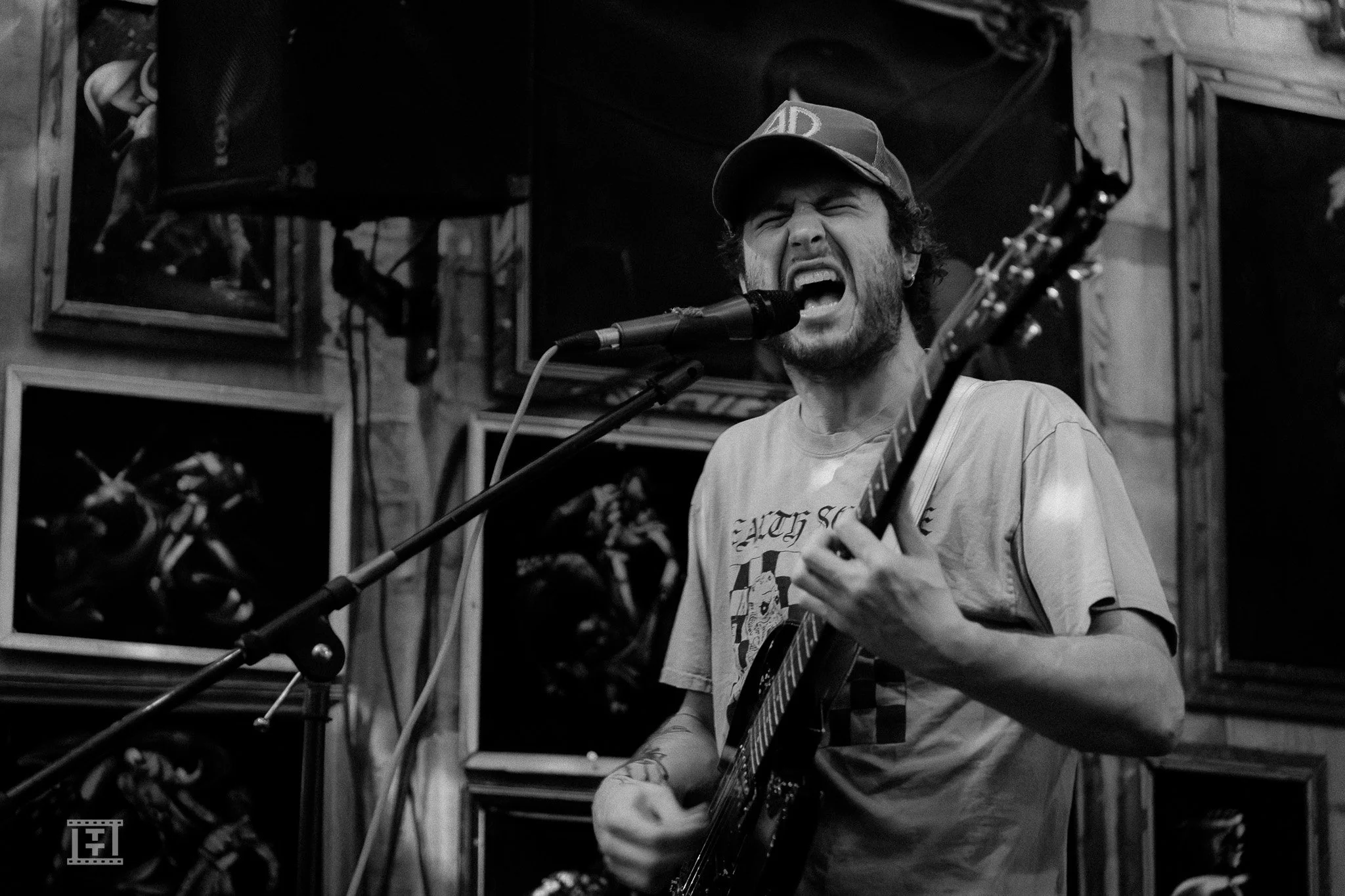A man passionately singing and playing an electric guitar in a music venue, with framed artwork behind him. View fullsize