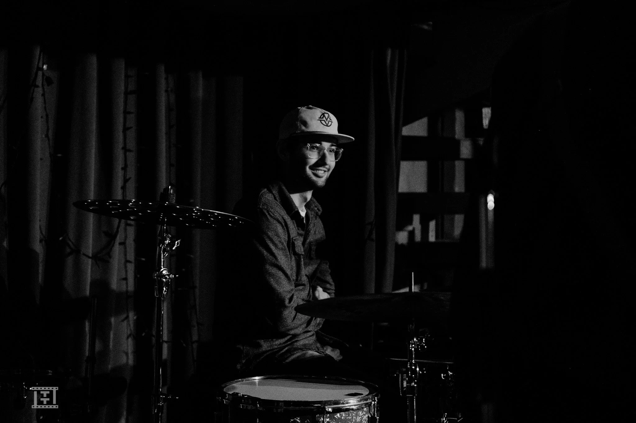 A smiling young man wearing glasses and a baseball cap, sitting behind a drum set in a dimly lit room.