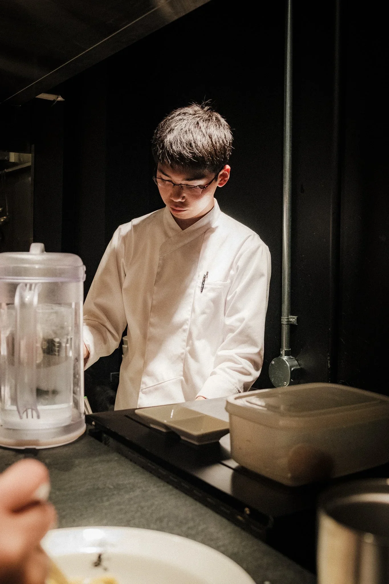 A young male chef wearing glasses and a white chef's coat is working in a dark kitchen.