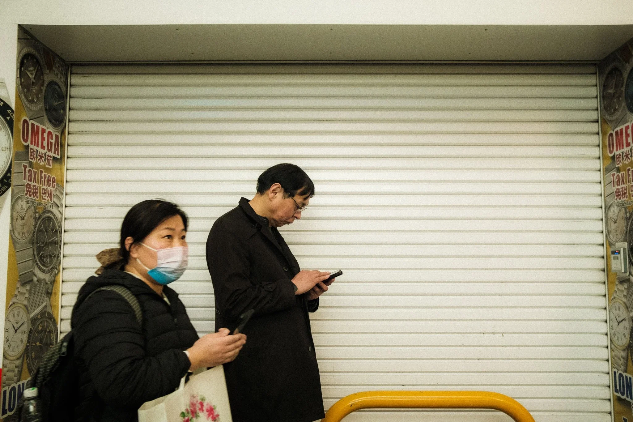 Two people standing in front of a closed shop roller shutter, both using their phones. The woman on the left is wearing a black jacket, a face mask, and has a bag on her shoulder. The man on the right is wearing glasses and a black jacket.
