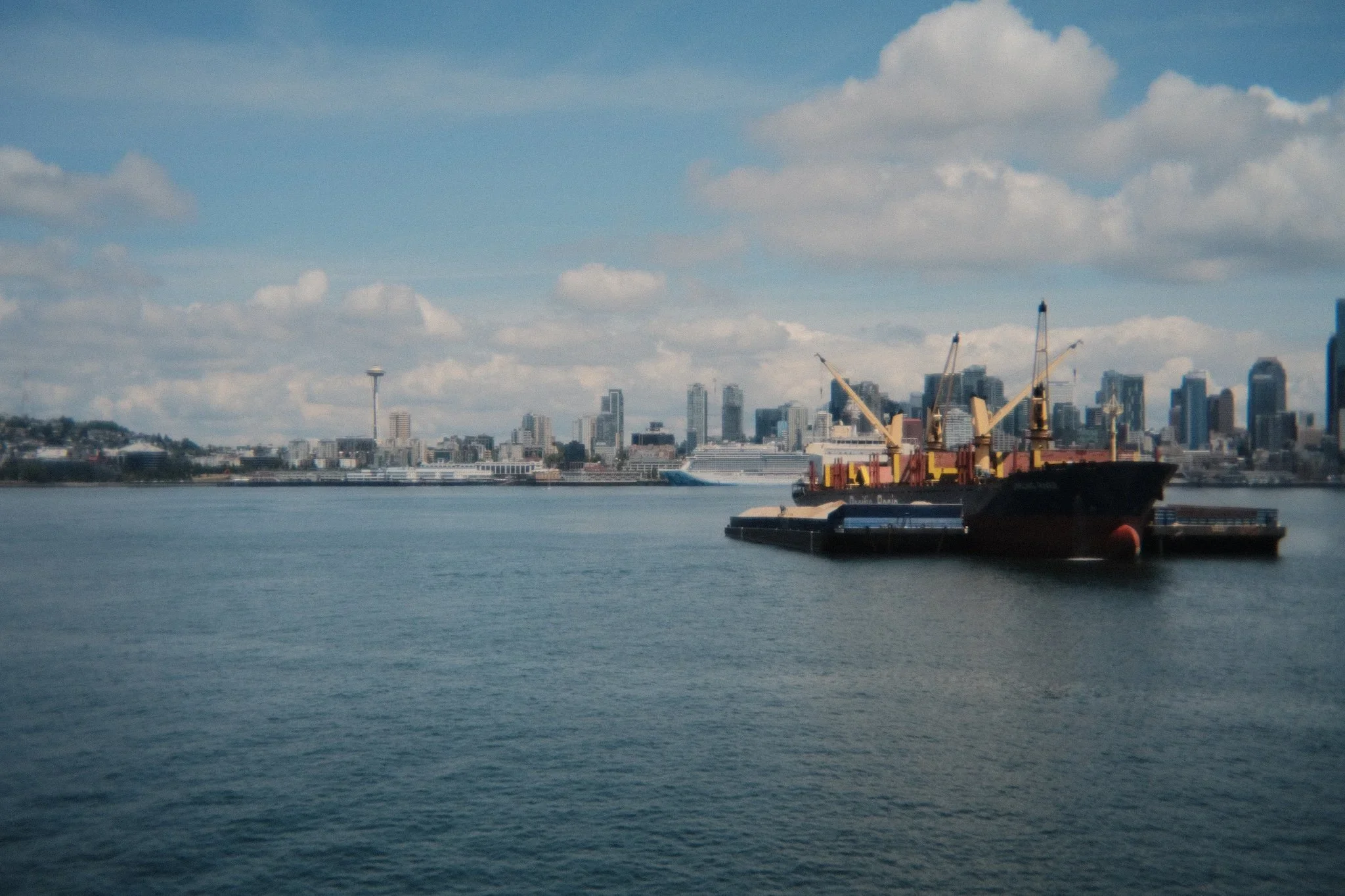 A harbor with a large cargo ship docked, city skyline with tall buildings and the Space Needle in the background, blue sky with scattered clouds.