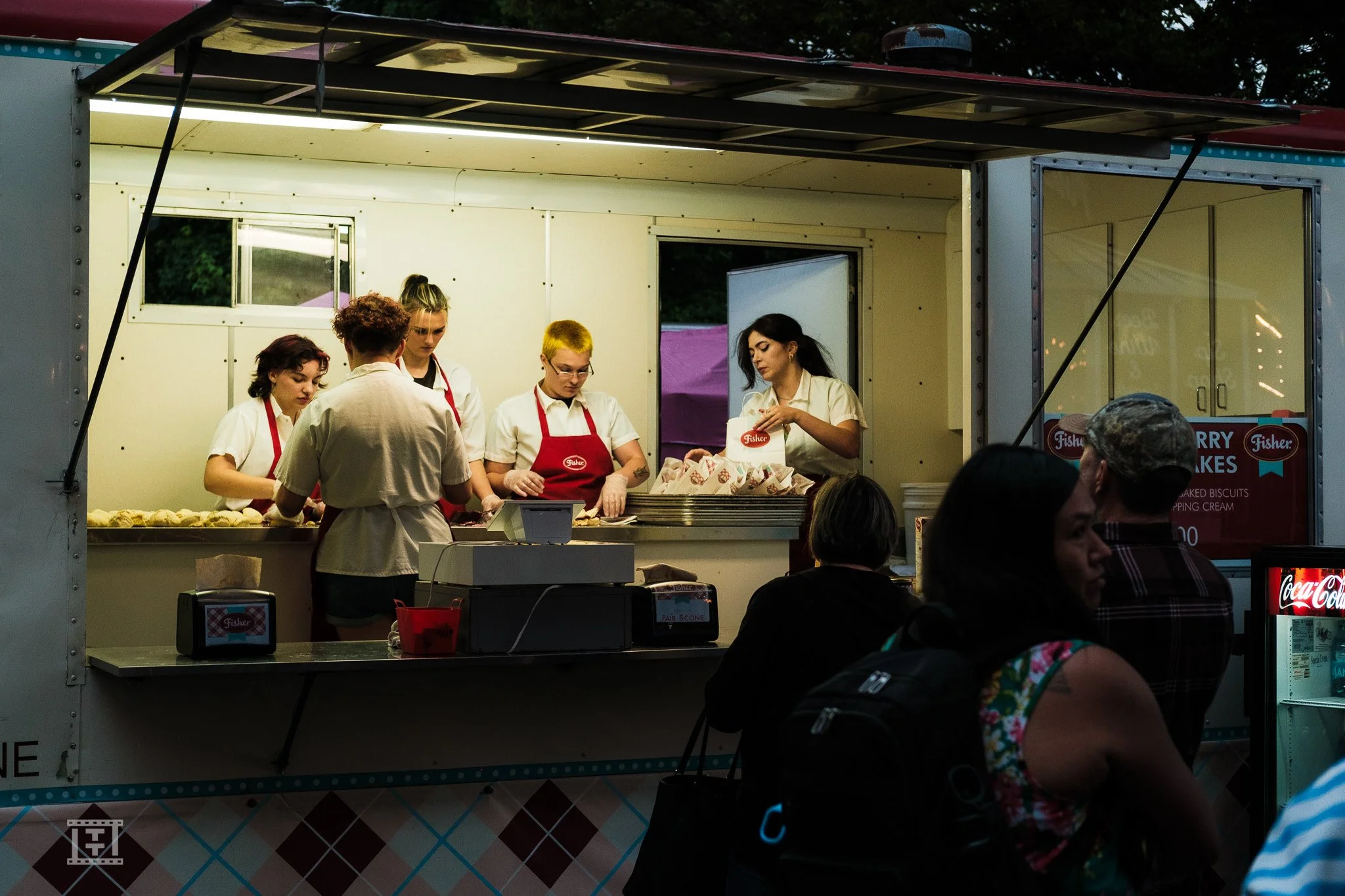 People working at a food stand, preparing strawberry shortcakes at an outdoor event during evening hours with customers waiting in line. View fullsize