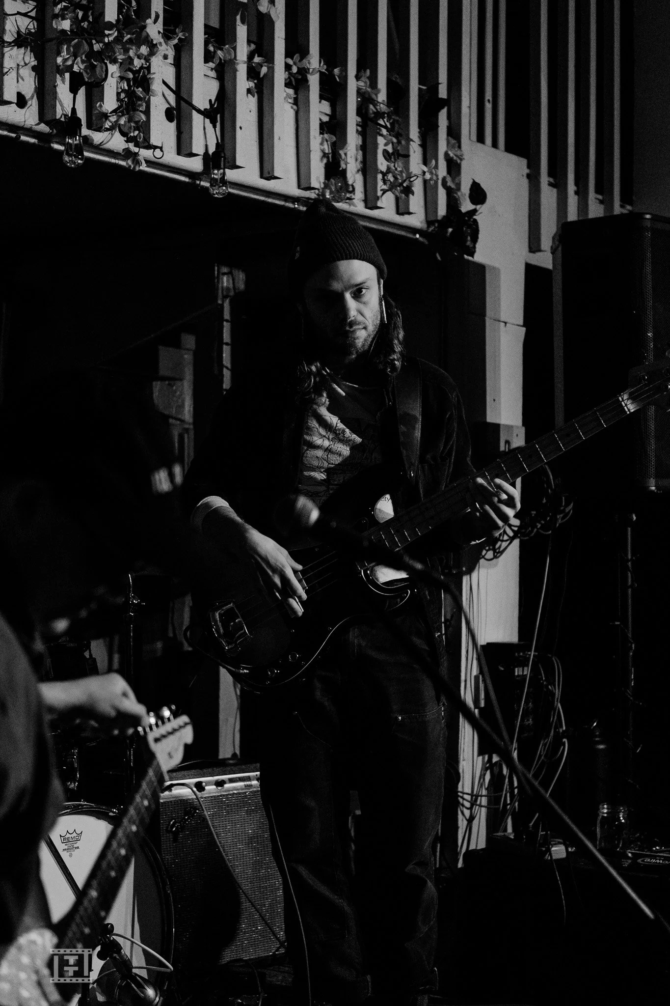 A black-and-white photo of a man with long hair playing an electric bass guitar in a music studio or performance space with musical equipment and decorations in the background.