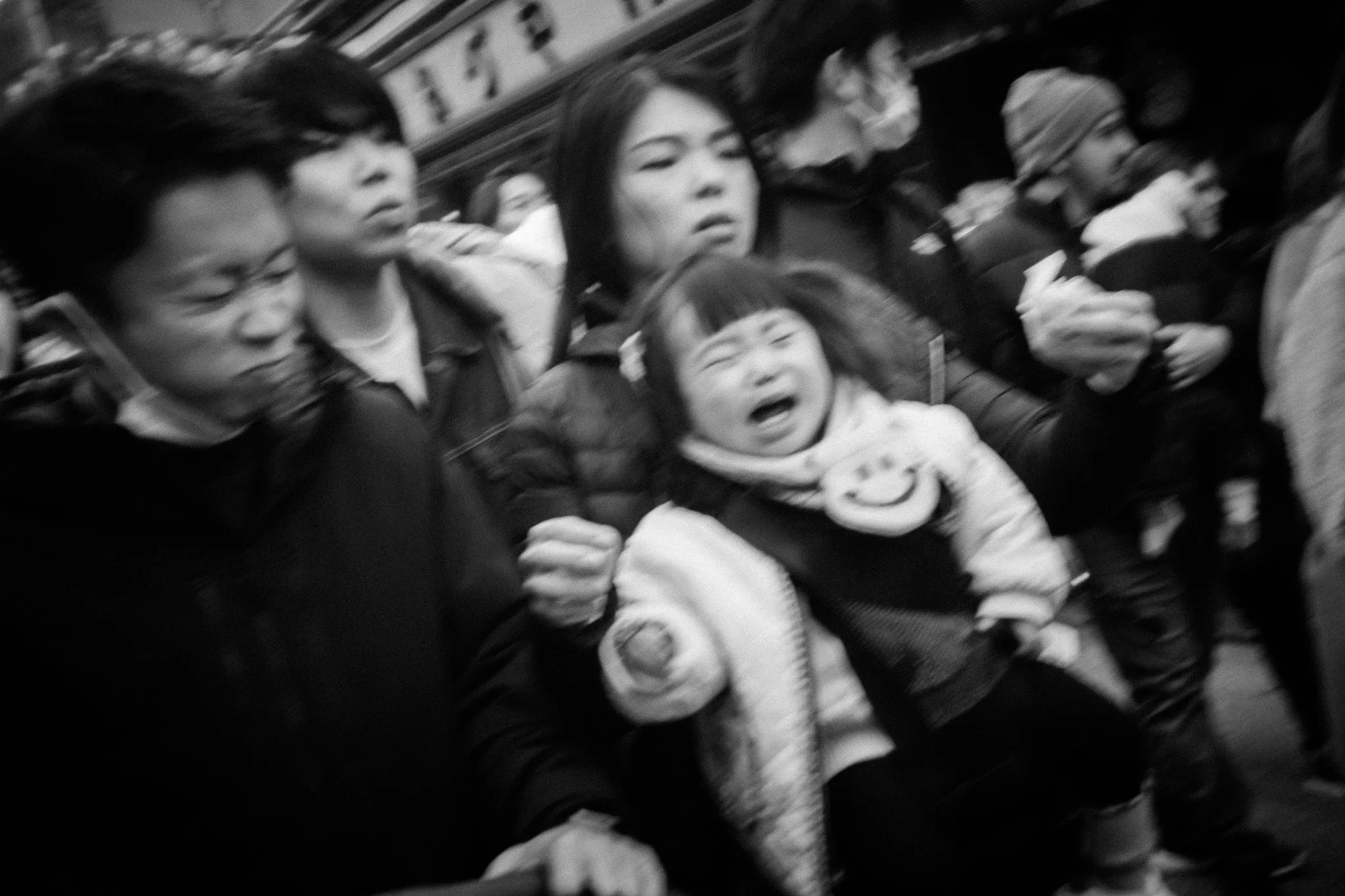 Black and white photo of a crying young girl being held tightly in a crowded street with other people around her.