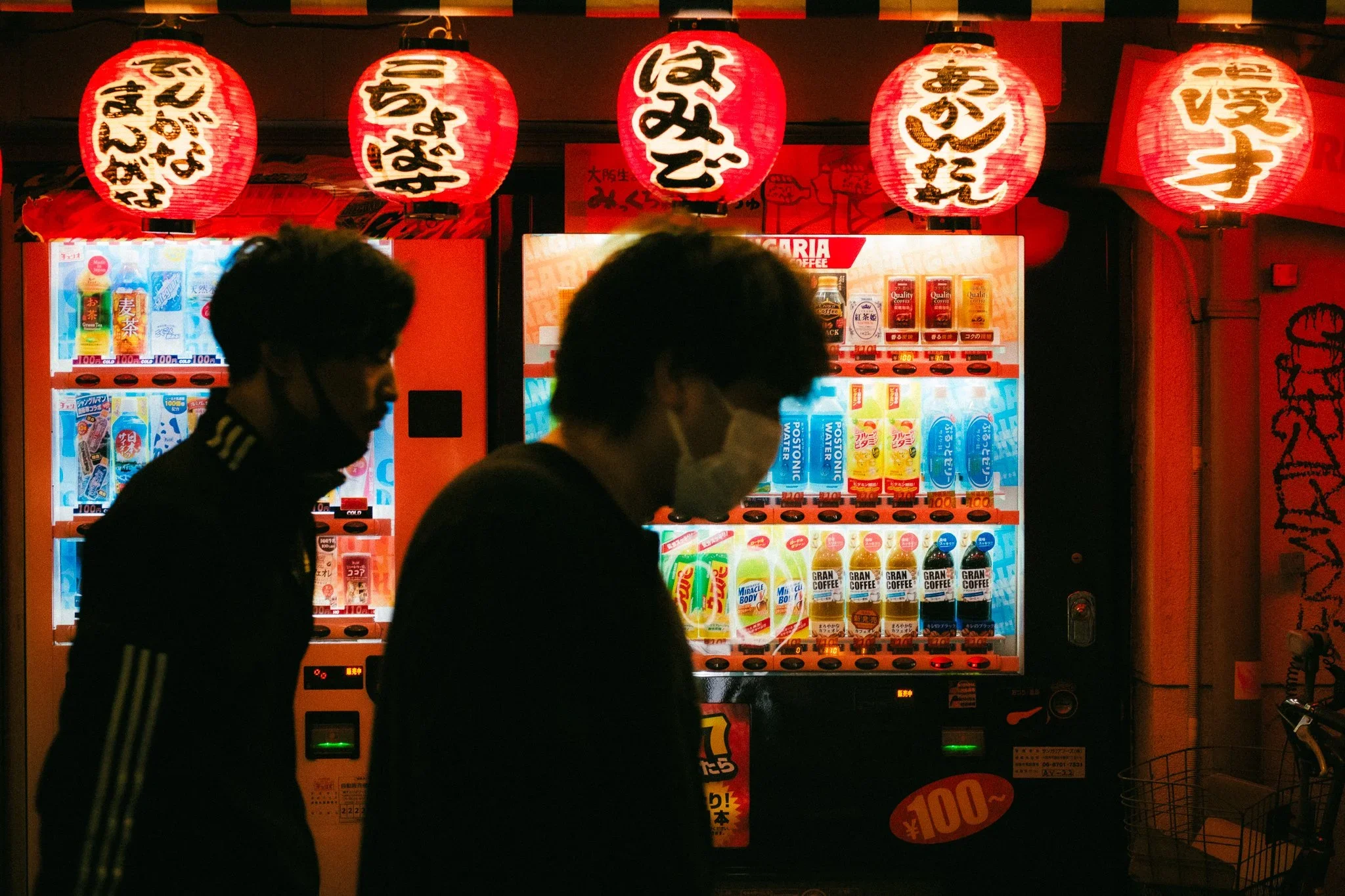 Two silhouetted individuals wearing face masks walk past a vending machine illuminated with bright drinks, topped with red paper lanterns with Japanese characters in Osaka.
