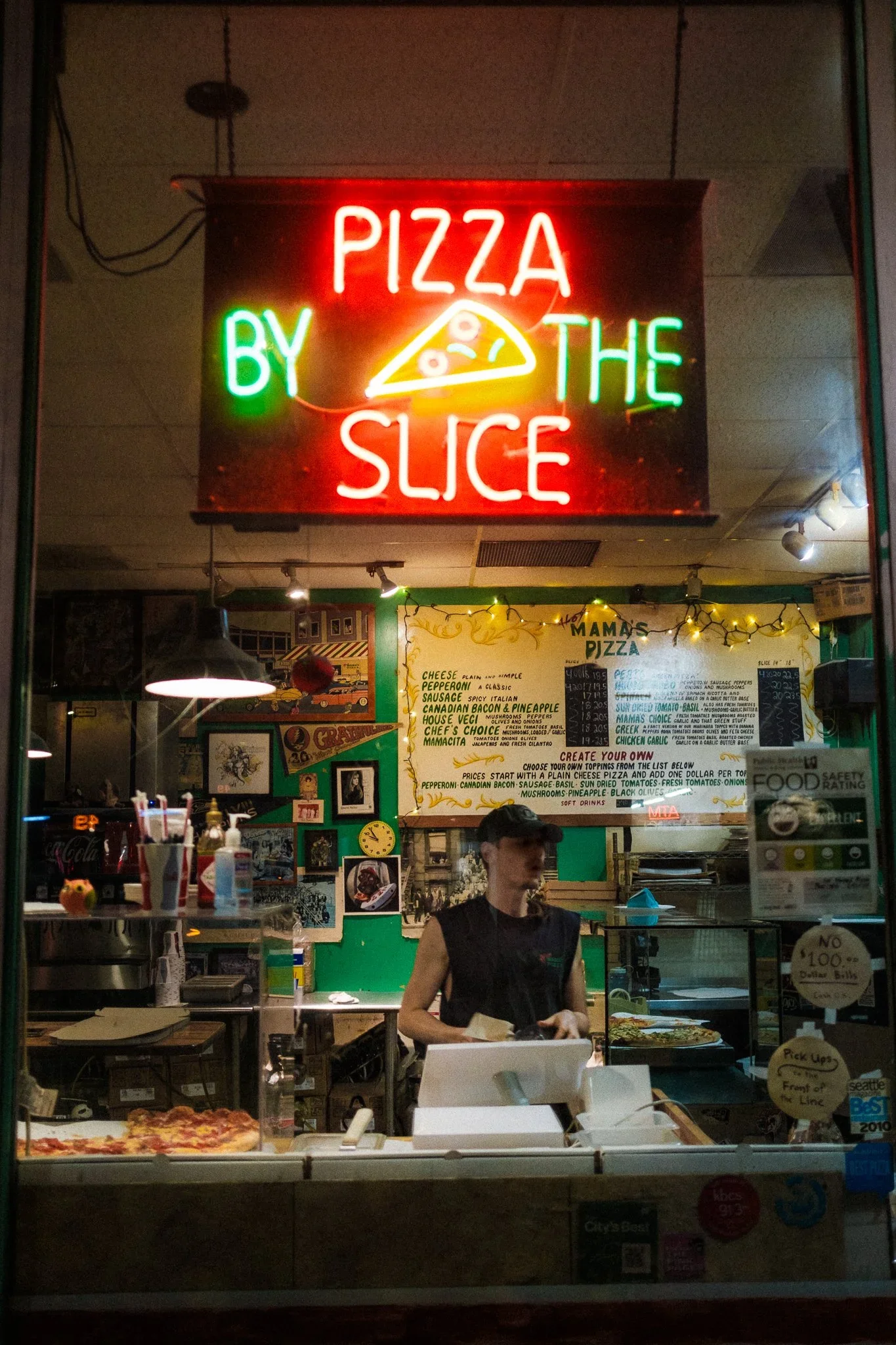 Neon sign outside a pizza restaurant that reads 'Pizza by the Slice' with a slice of pizza illustration. Inside, a woman behind the counter prepares pizza, with menu boards and pizza slices visible.