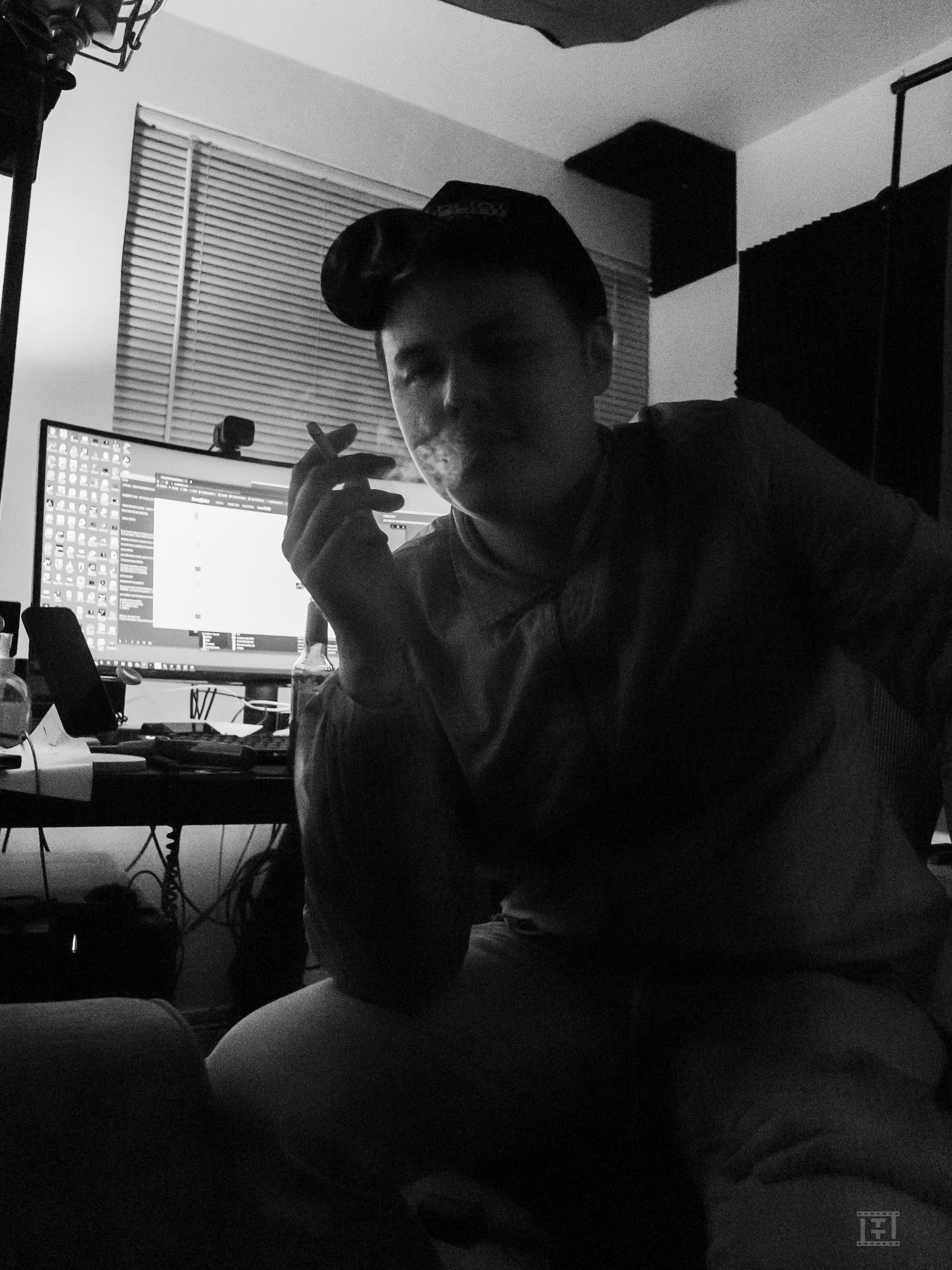 A person wearing a cap making a peace sign in a room with a computer setup, in black and white. View fullsize