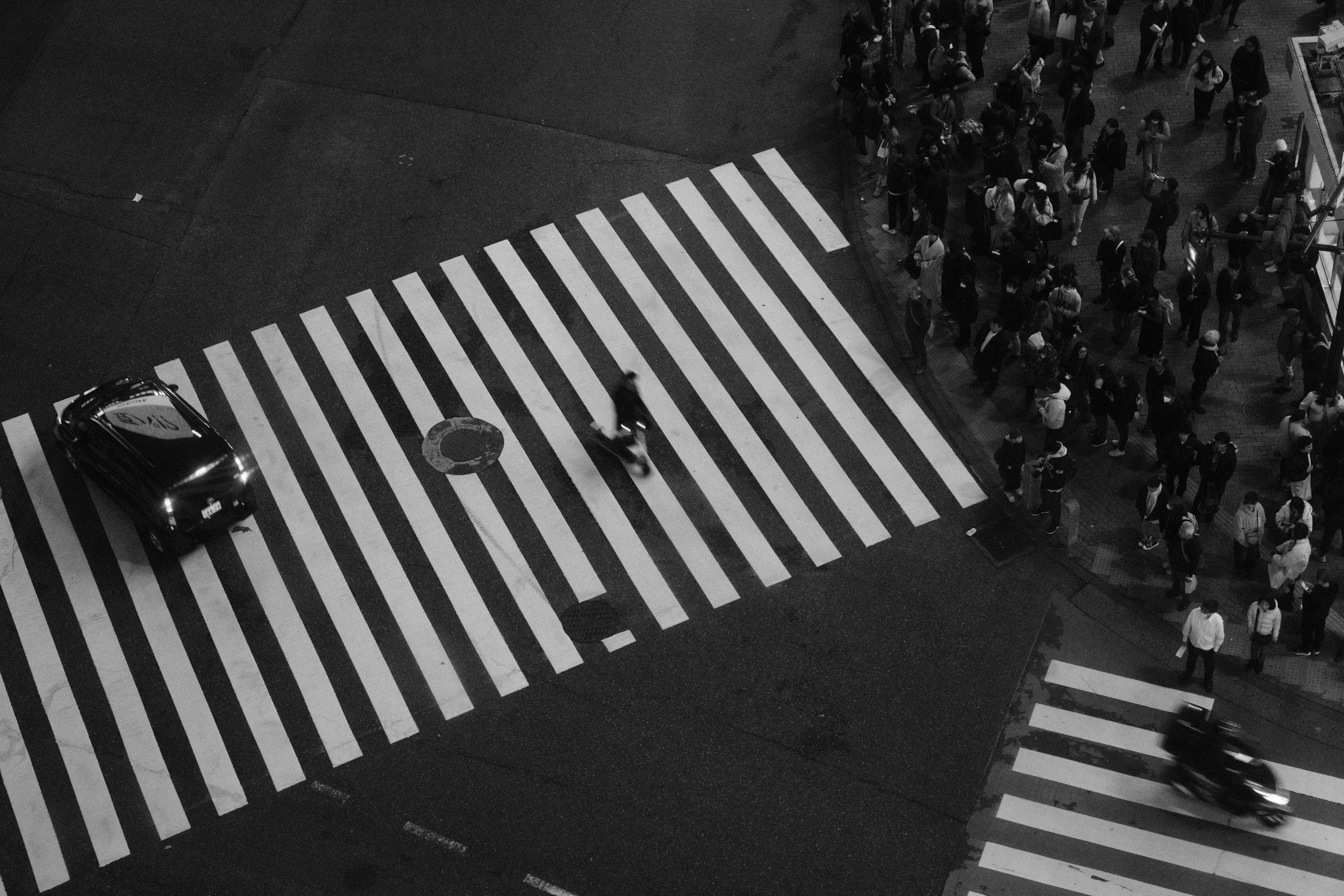 A black and white aerial view of Shibuya Crossing with a crowd of pedestrians waiting to cross at a crosswalk. A car and a motorcycle are visible on the road, and the crosswalk has bold white stripes.