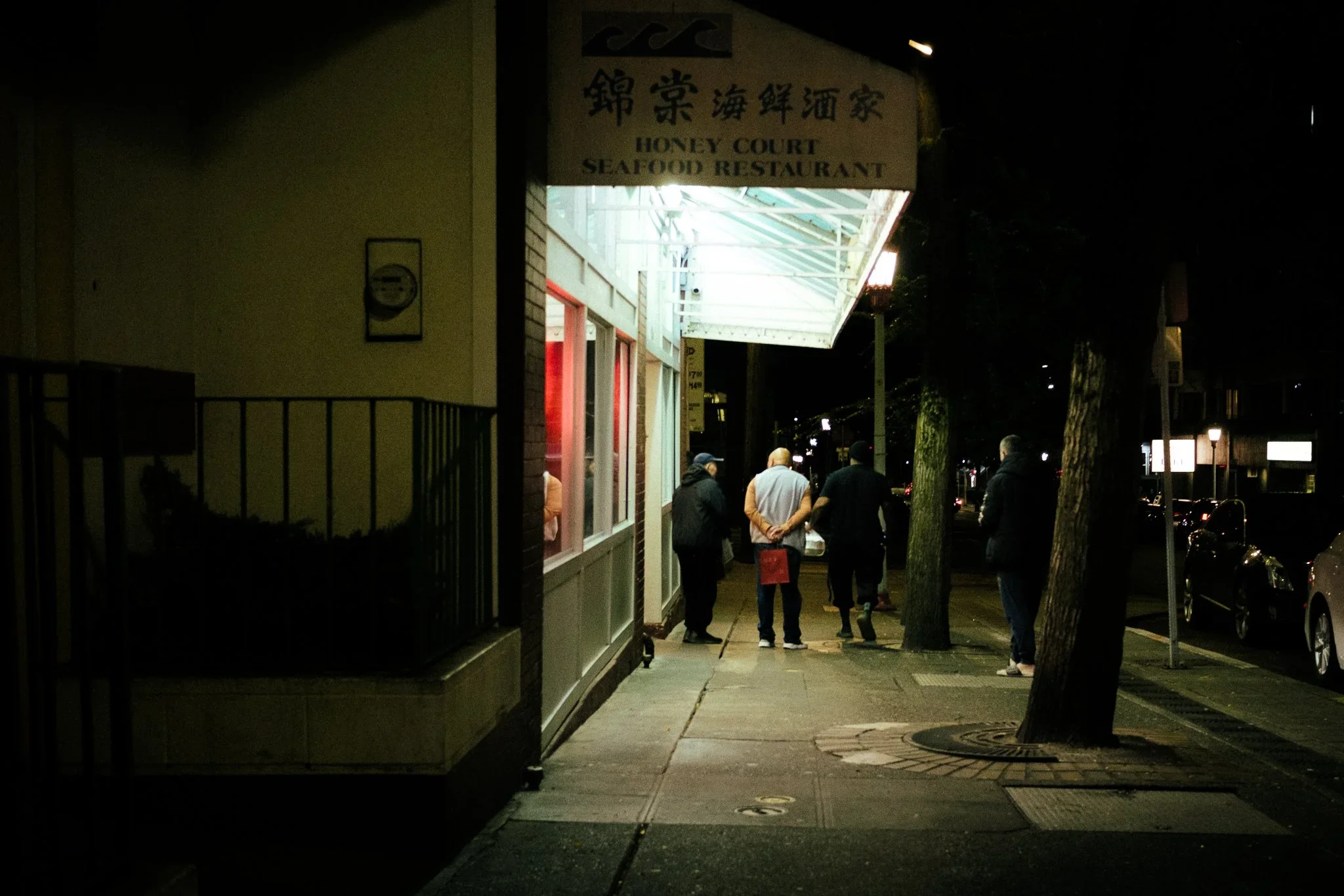 Nighttime sidewalk scene outside Honey Court seafood restaurant with people walking past. View fullsize