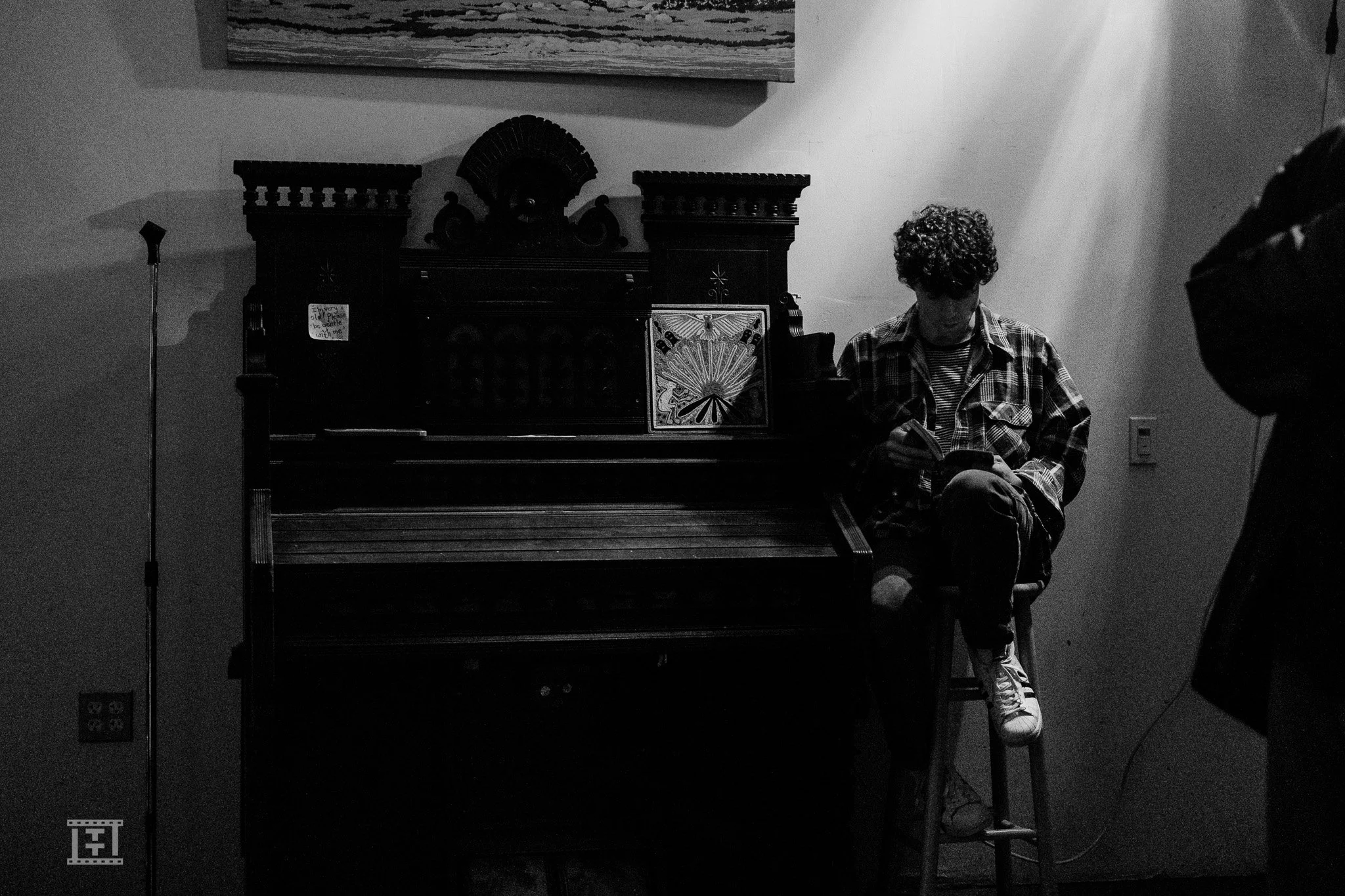 A young person with curly hair sitting on a stool at a vintage upright piano, reading a book, with a person on the right holding a camera. The scene is dimly lit, casting shadows, in a room with a painting on the wall.