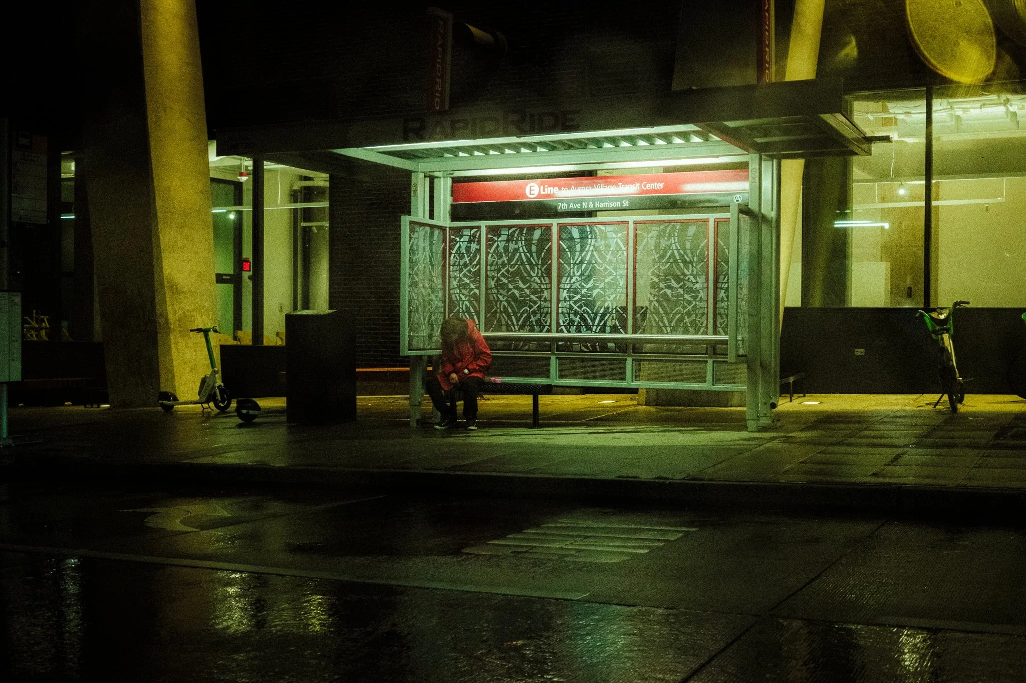 A person in a red jacket sitting alone on a bench at a rain-soaked bus stop shelter at night, with a sign indicating the stop for the 'E Line' to Aurora Village Transit Center on 7th Ave N & Harrison St, with bicycles and scooters nearby. View fullsize