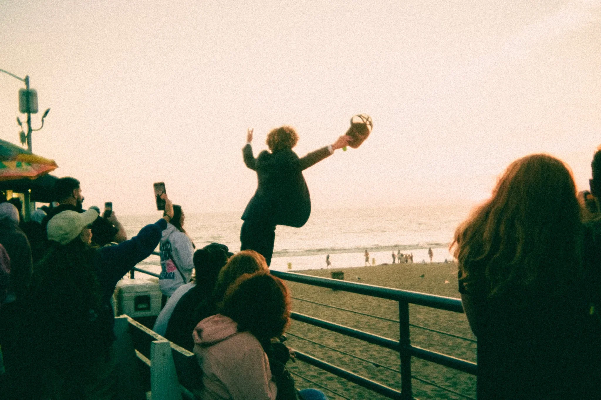 Person with curly hair and a dark suit standing on the railing at the beach, holding a hat in the air, with many people taking photos and watching near the shore during sunset.