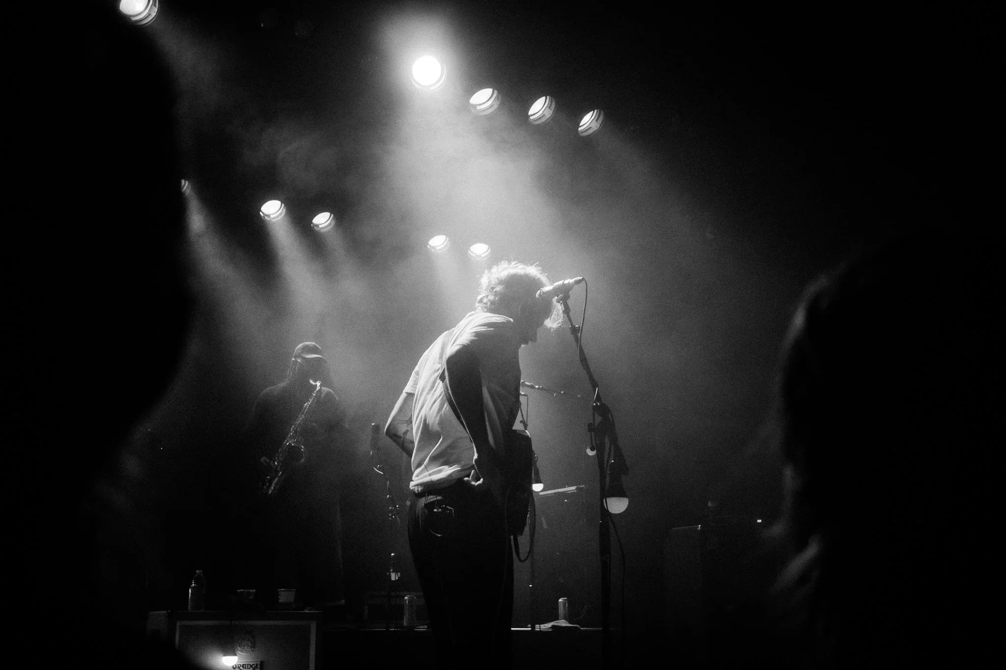Black and white photo of a man singing and playing guitar on stage, with a drummer behind him playing drums, and abstract light designs projected on the background.