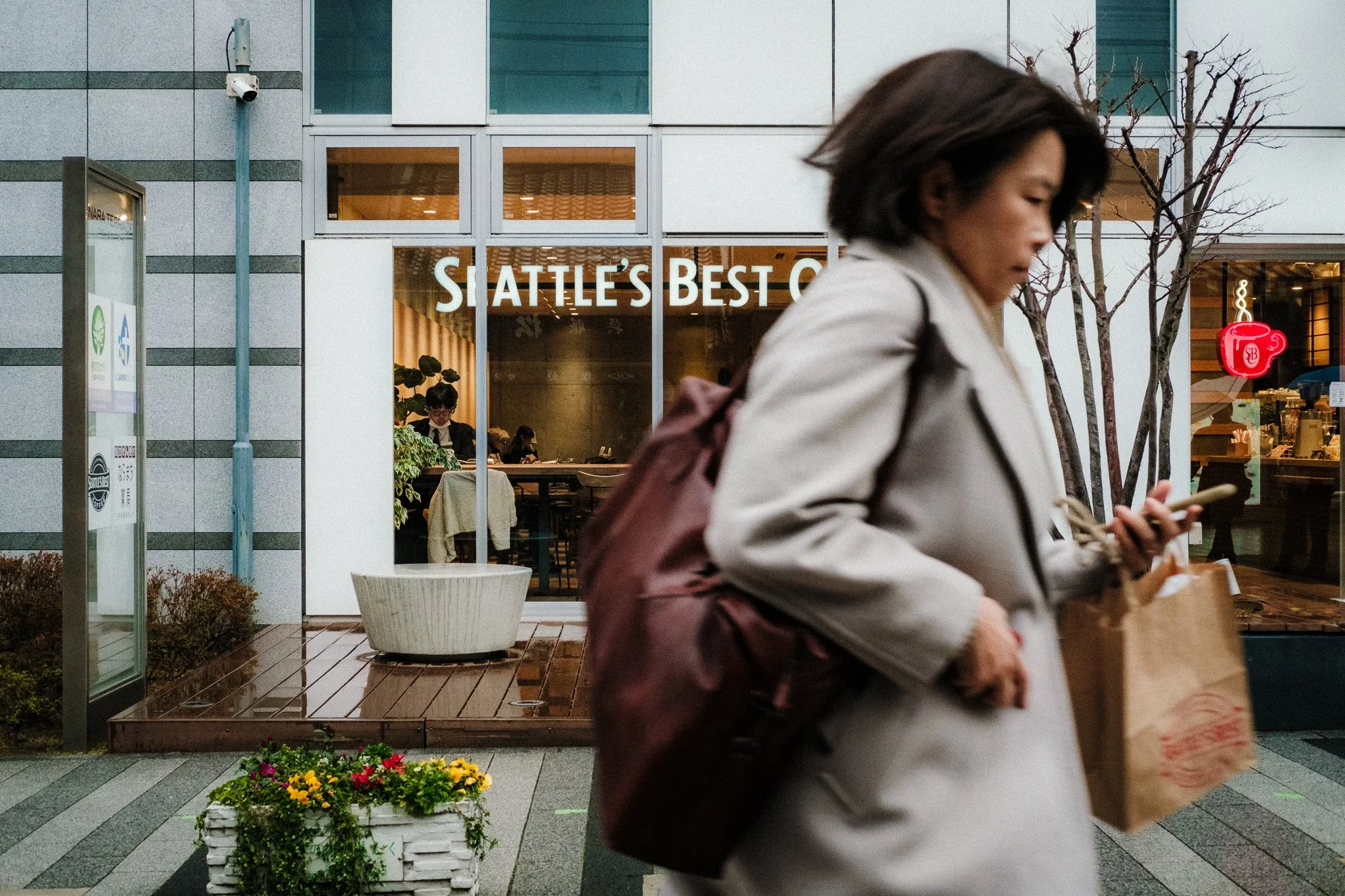A woman in a beige coat walking past a coffee shop with people inside, holding a paper bag and a phone, with trees and a flower planter in the foreground. View fullsize